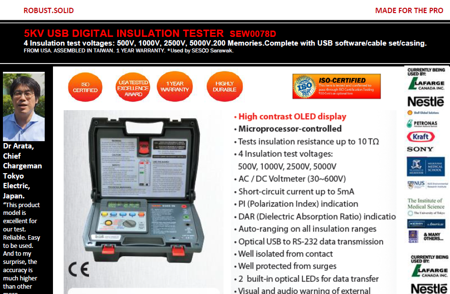 ● High contrast OLED display ● Microprocessor-controlled ● Tests insulation resistance up to 10 TΩ ● 4 Insulation test voltages: 500V, 1000V, 2500V, 5000V ● AC / DC Voltmeter (30~600V) ● Short-circuit current up to 5mA ● PI (Polarization Index) indication ● DAR (Dielectric Absorption Ratio) indication ● Auto-ranging on all insulation ranges ● Optical USB to RS-232 data transmission ● Well isolated from contact ● Well protected from surges ● 2 built-in optical LEDs for data transfer ● Visual and audio warning of external voltage presence (≥30Vac or ≥30Vdc) ● Auto-hold function to freeze reading ● Overload protection ● Adjustable testing duration: 1~30 minutes ● Internal memory for data storage ● Displays testing duration for insulation measurement ● Auto-off function ● 200 measurement results can be saved in memory and recalled on display