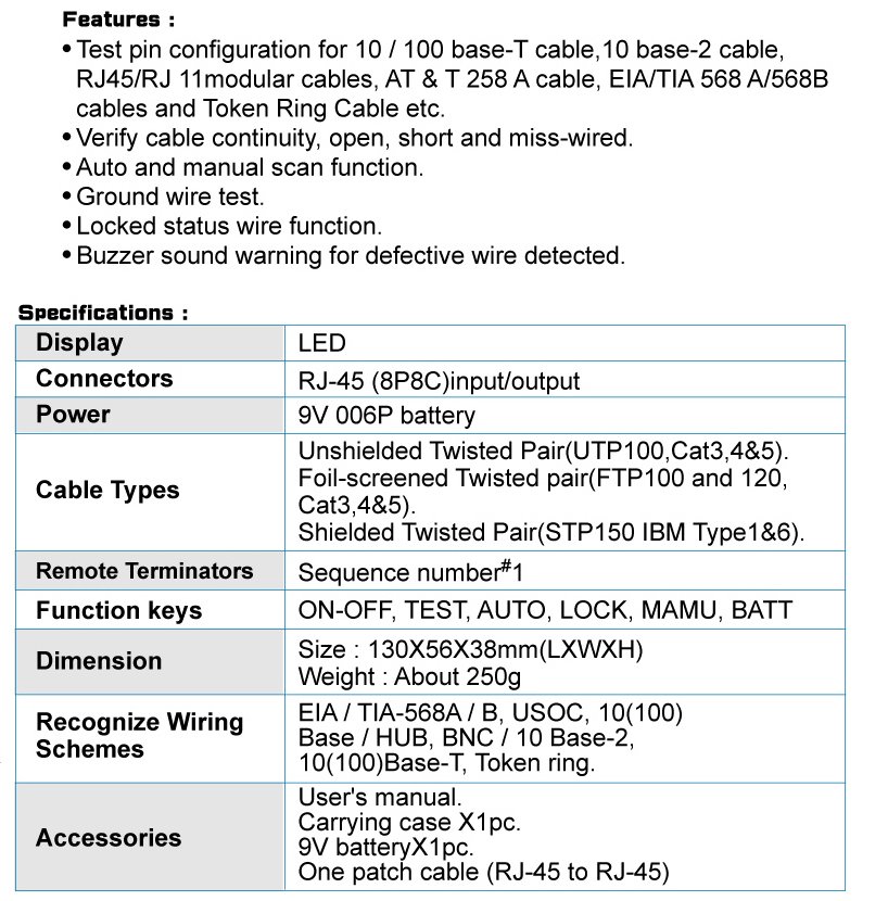 - Test pin configuration for 10/100 base-T cable, 10 base-2 cable, RJ45/RJ11 modular cables, AT and T 258 A cable, EIA/TIA 568A/568B cables and Token Ring Cables etc.