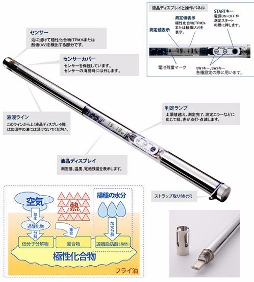 This instrument is capable of measuring both TPM (Total Polar Materials), a standard used in Europe as an indicator of the overall quality of frying oil, as well as AV (Acid Value), which indicates changes in cooking oil properties.